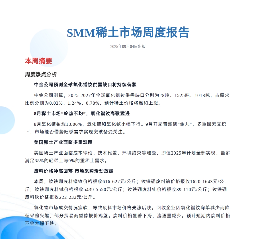 9月4日SMM稀土市场周报发布,行情、报价、资讯一览无余!