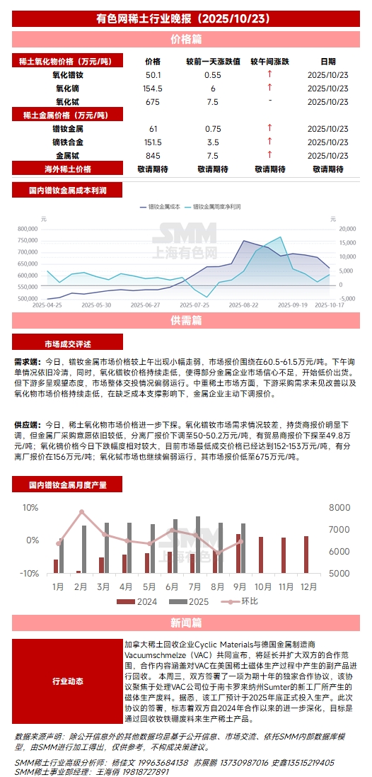 【10月23日SMM稀土行业晚报】今日,镨钕金属市场价格较上午出现小幅走弱,市场报价围绕在60.5-61.5万元/吨。下午询单情况依旧冷清,同时,氧化镨钕价格持续走低,使得部分金属企业市场信心不足,开始低价出货。但下游多呈观望态度,市场整体交投情况偏弱运行。