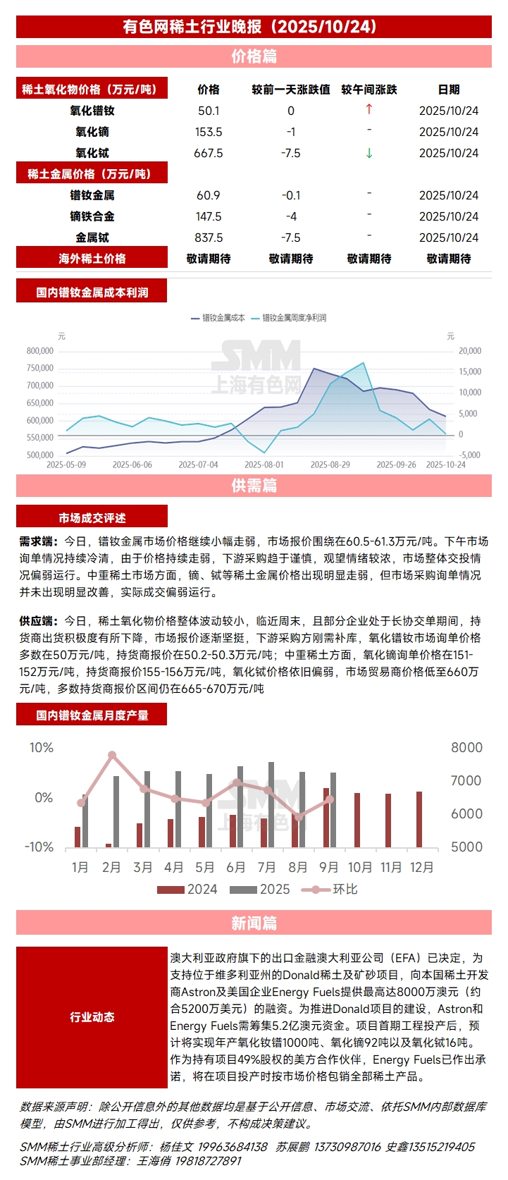 【10月24日SMM稀土行业晚报】今日,镨钕金属市场价格继续小幅走弱,市场报价围绕在60.5-61.3万元/吨。下午市场询单情况持续冷清,由于价格持续走弱,下游采购趋于谨慎,观望情绪较浓,市场整体交投情况偏弱运行。中重稀土市场方面,镝、铽等稀土金属价格出现明显走弱,但市场采购询单情况并未出现明显改善,实际成交偏弱运行。