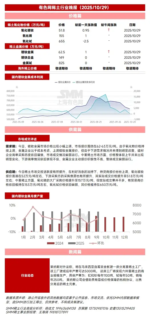 【10月29日SMM稀土行业晚报】今日,镨钕金属市场价格出现小幅上调,市场报价围绕在62-63万元/吨。由于氧化物价格持续上调,金属企业出于成本考虑,上调镨钕金属报价,但由于下游需求情况并未得到明显改善,磁材企业询单采购态度依旧谨慎,市场成交情况偏弱运行。中重稀土市场方面,价格整体较上午并未出现明显变化,下游询单情况依旧表现不佳,金属企业主动报价积极性不高,整体成交偏弱运行。