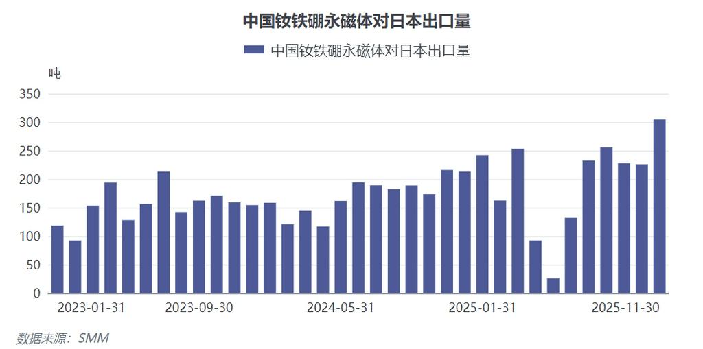 SMM讯:2026年1月6日,商务部发布公告称,为维护国家安全和利益、履行防扩散等国际义务,决定加强两用物项对日本出口管制。该公告明确规定禁止所有两用物项向日本军事用户、军事用途以及一切有助于提升日本军事实力的其他最终用户用途出口,且任何国家和地区的组织和个人违反上述规定将追究法律责任,公告自公布之日起正式实施。该项措施虽在日本反复触及中方底线时就有所预料,但伴随着11月中方磁材出口日本创近两年新高的数据发布,该项举措直击日本核心需求领域。两用物项指既有民事用途又有军事用途或有助于提升军事潜力的货物、技术和服务,包括稀土、高性能芯片、碳纤维等。禁止对日出口后对国内磁材行业的影响需从多维度分析,尤其在当前国内需求不景气的格局下,限制对日出口的影响更显复杂。