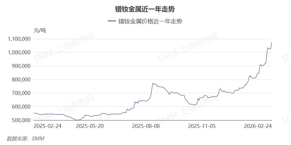 SMM讯:受多重因素影响,今日轻稀土价格呈现暴涨行情。镨钕氧化物市场报价区间为88-89万元/吨,较节前上涨约3.5万元/吨,涨幅超过4.12%;与去年同期相比,涨幅高达98%。镨钕金属报价区间为107-108万元/吨,较节前上涨5万元/吨,涨幅达4.88%,同比涨幅亦达95%。原材料价格在开年首个交易日的大幅拉涨,令尚未完全复工的下游永磁材料与电机制造企业措手不及。尽管部分企业在节前已对涨势有所预期,但当涨价成为现实时,仍有不少磁材厂以“诶呦我去”的惊叹开启了复工首日的市场交易。针对本轮价格异动,SMM分析师进行了专项市场调研,以探讨稀土价格持续上行对磁材与电机环节产生的实际影响。