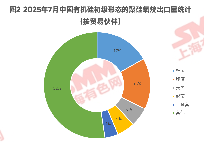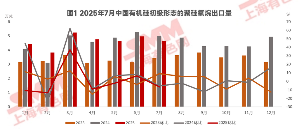 【SMM分析:2025年7月有机硅出口数据简析】2025年7月,中国有机硅初级形态的聚硅氧烷出口量在4.64万吨,环比减少6.64%,同比减少7.01%;2025年1-7月有机硅初级形态的聚硅氧烷累计出口量为32.5万吨,同比增加1.85%。其中7月流向韩国的贸易量仍最大,为0.78万吨,环比6月减少6.39%,贸易量维持第一位,但较6月需求减少0.05万吨。