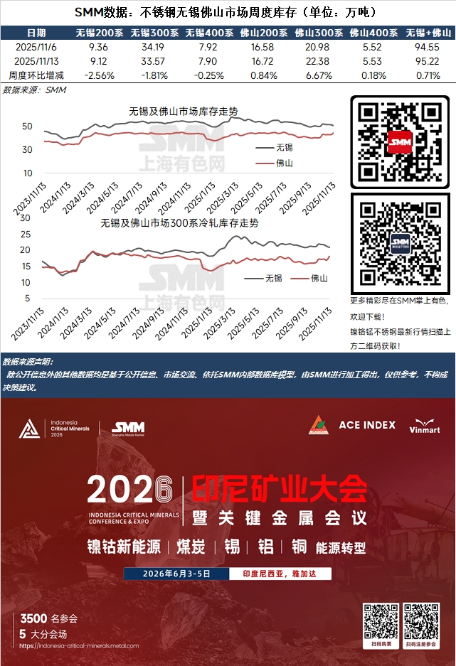 SMM11月13日讯,本周(2025年11月7日-11月13日),无锡和佛山两大不锈钢市场库存总量呈小幅累库趋势,从2025年11月6日的94.55万吨增至11月13日的95.22万吨,周环比上升0.71%。