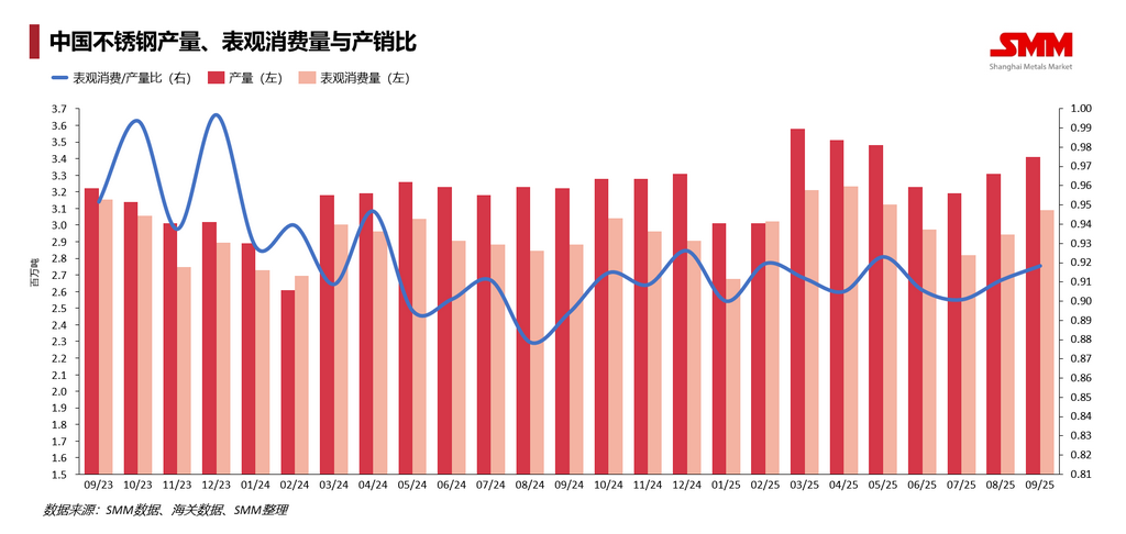 图:2023-2025年中国不锈钢产量与表观消费量对比。