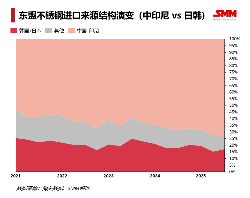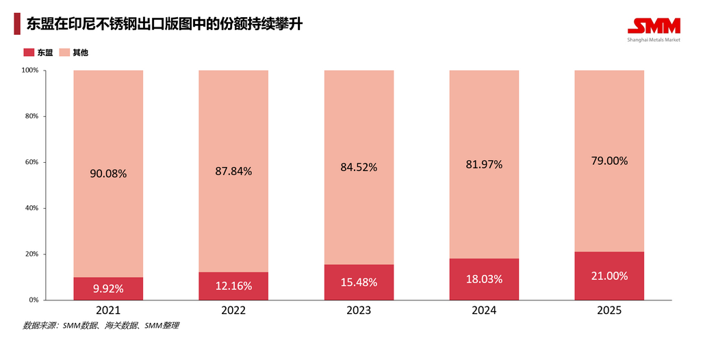图:2021-2025年印尼不锈钢出口流向结构变化图,显示东盟份额(红色)逐年显著扩大。