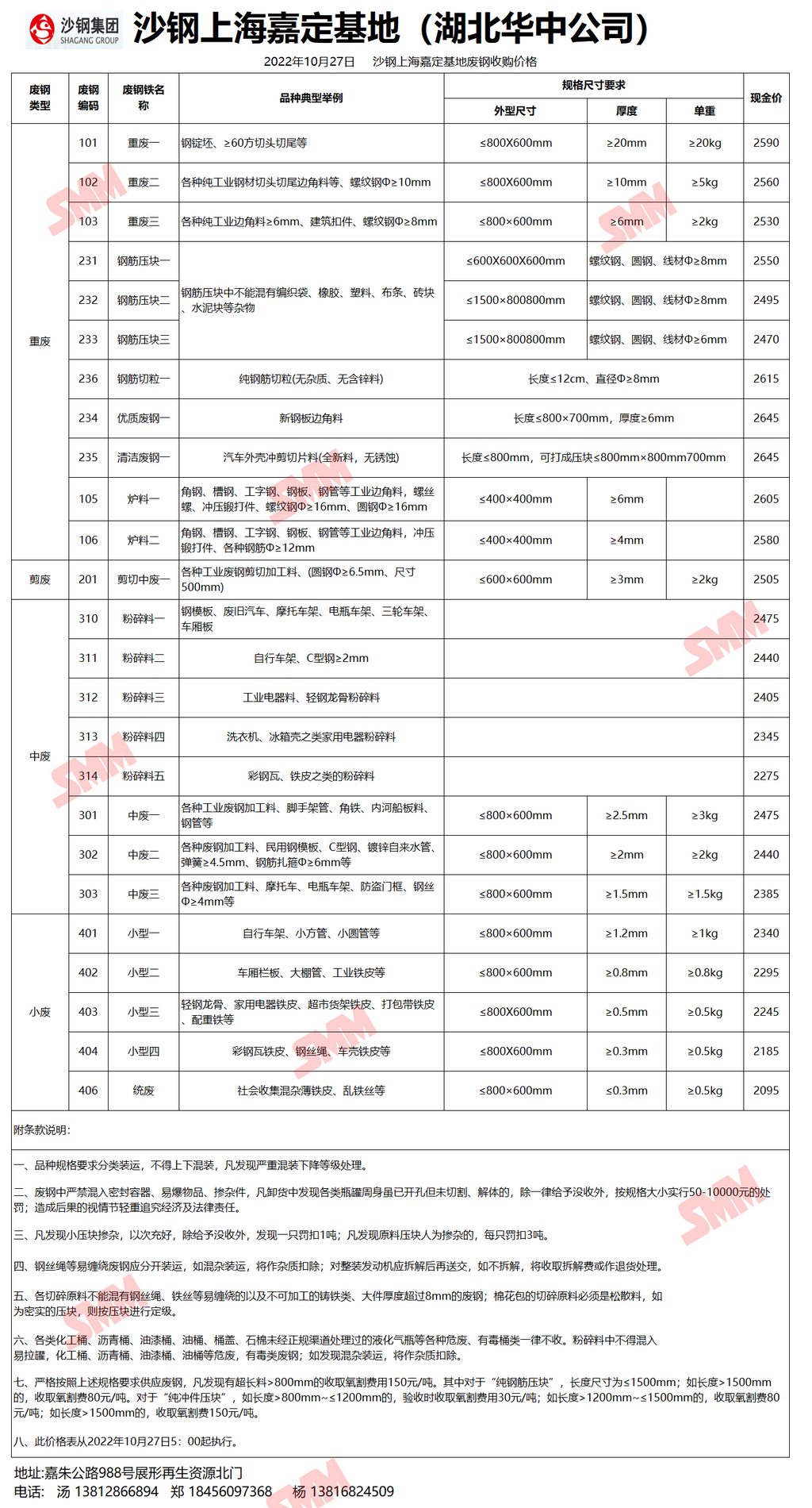 10月27日沙钢上海嘉定基地 废钢收购报价