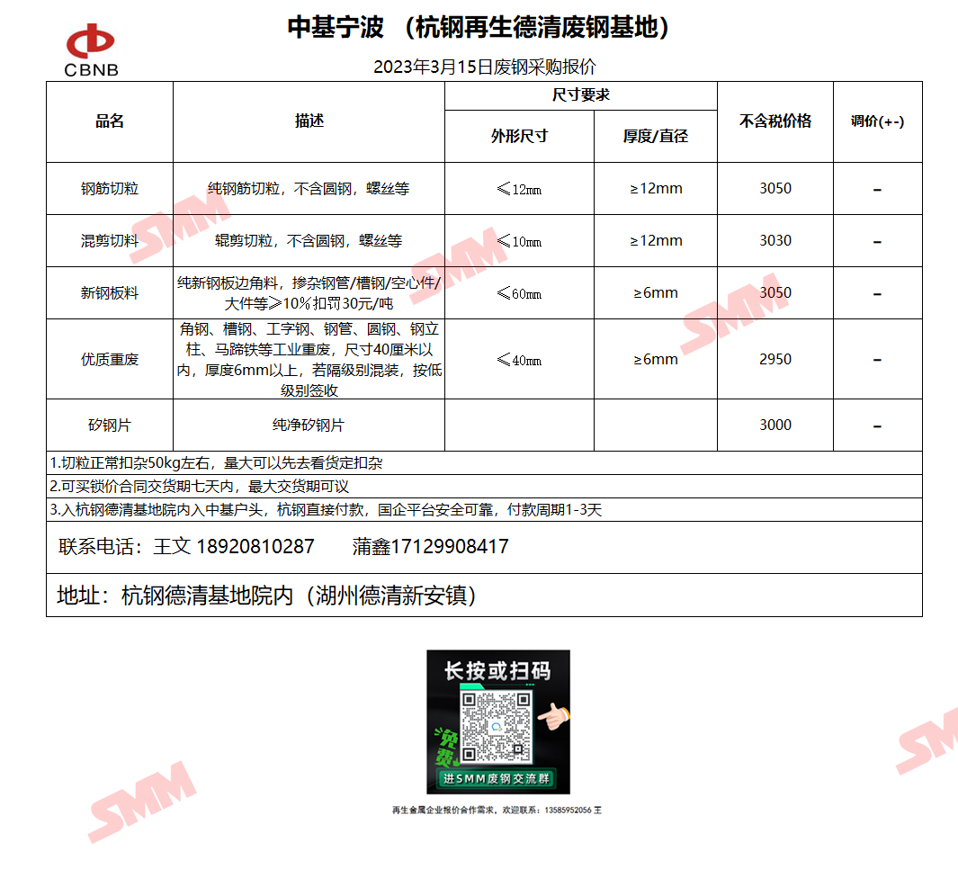 3月15日中基宁波 (杭钢再生德清废钢基地) 废钢采购报价