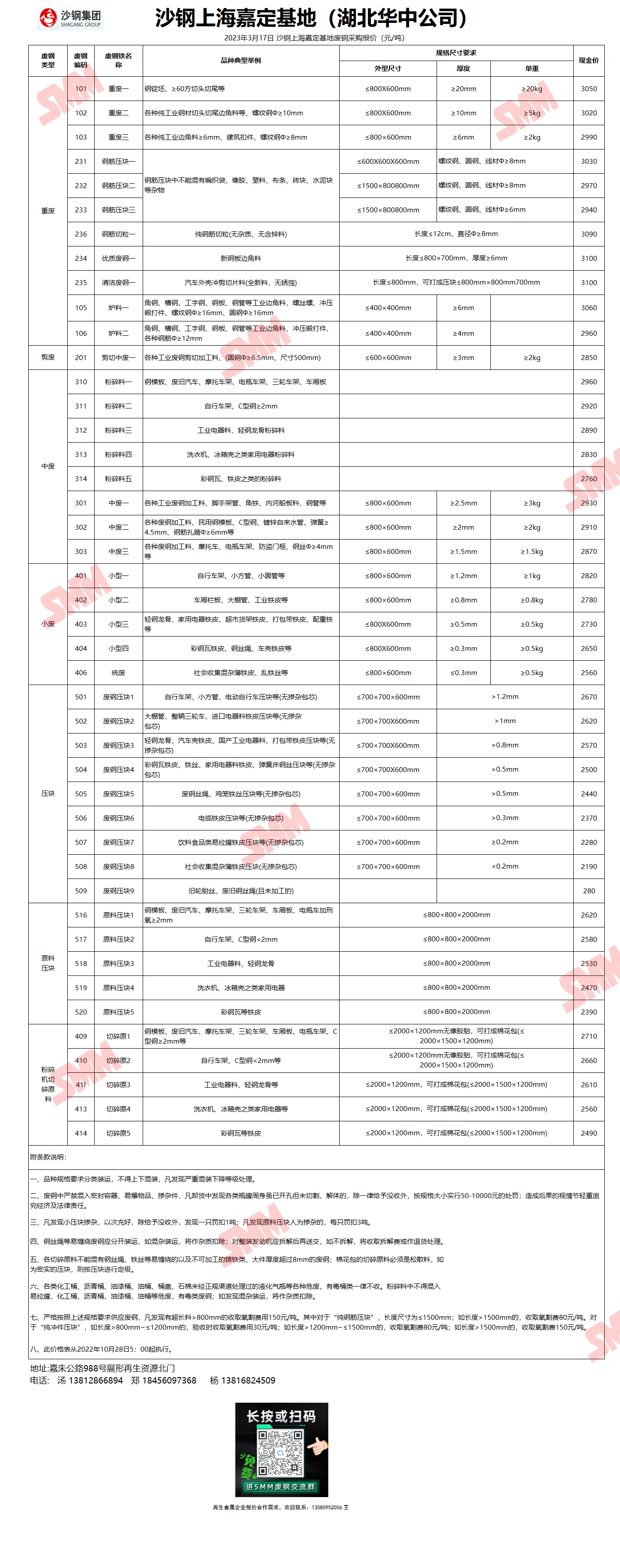 3月17日沙钢上海嘉定基地 废钢采购报价
