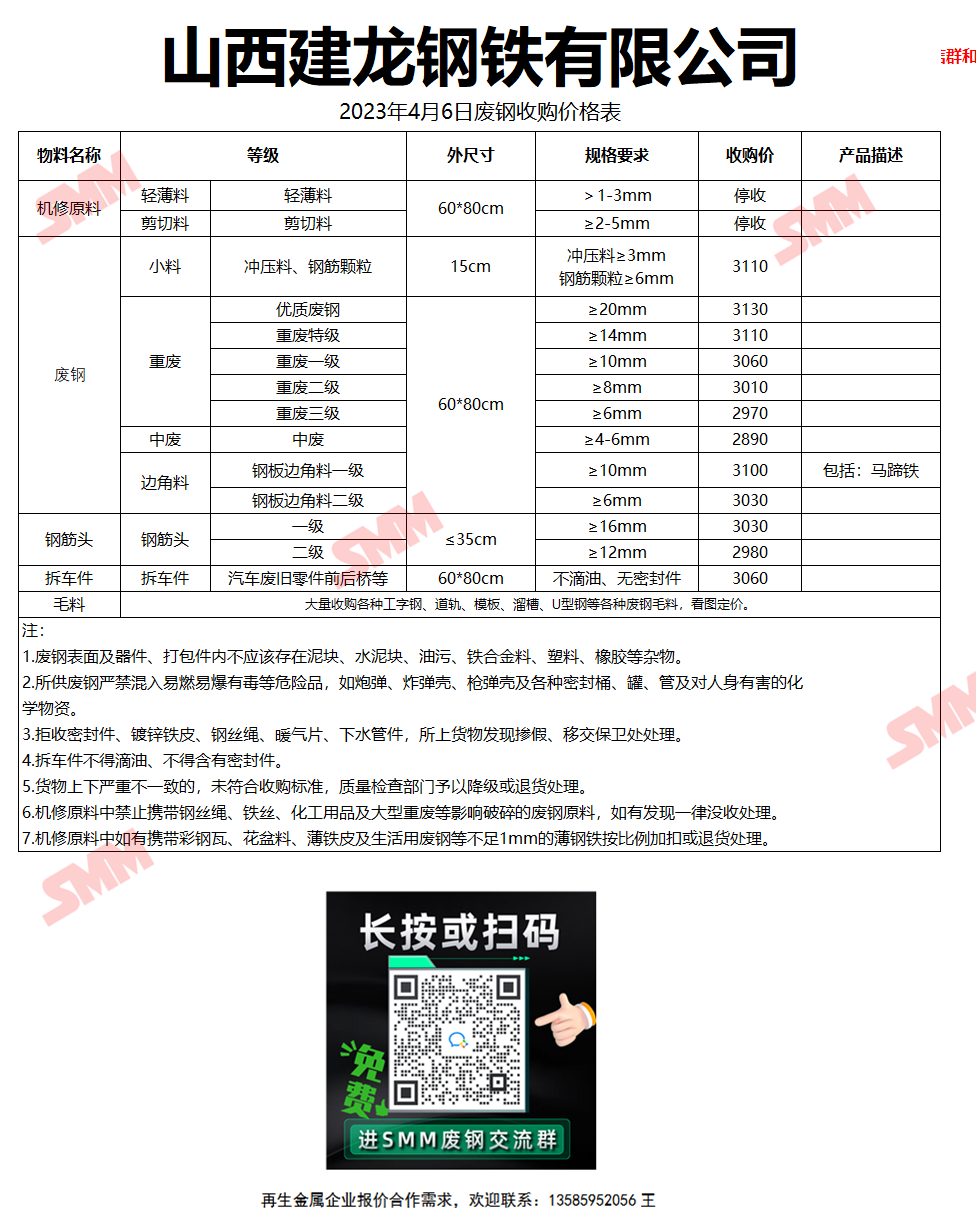 4月6日(10时35分)山西建龙钢铁 废钢收购报价