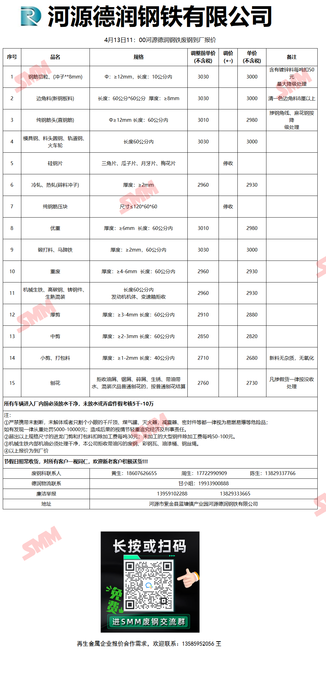 今日河源德润钢铁 废钢收购报价已更新,有货的朋友欢迎联系我们!