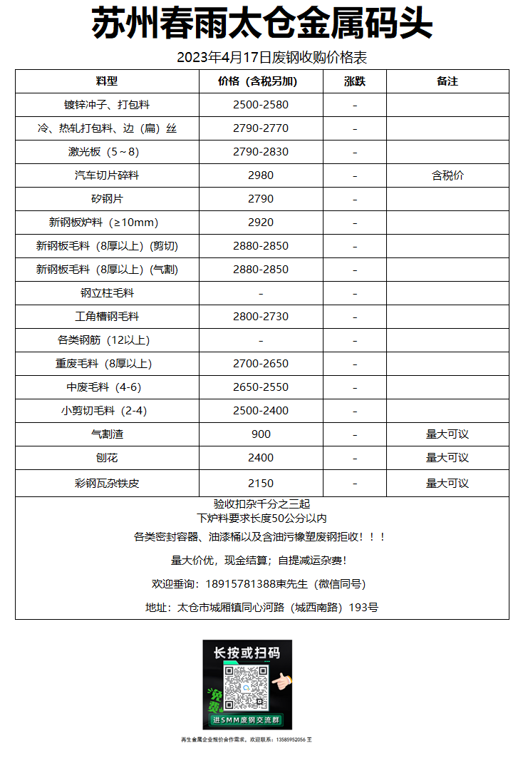 今日苏州春雨 废钢收购报价已更新,有货的朋友欢迎联系我们!