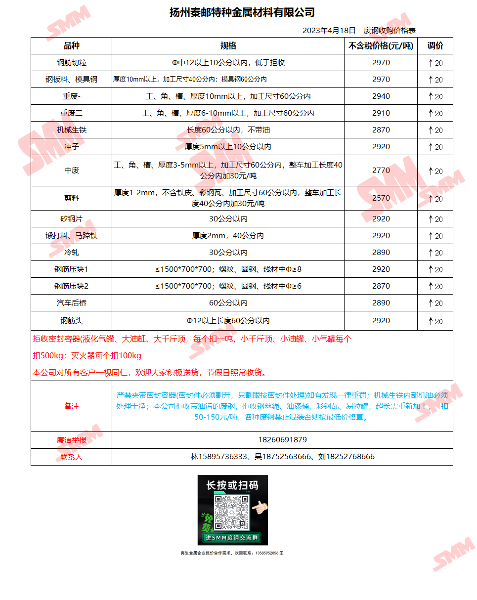 今日秦邮特钢 废钢收购报价已更新,有货的朋友欢迎联系我们!