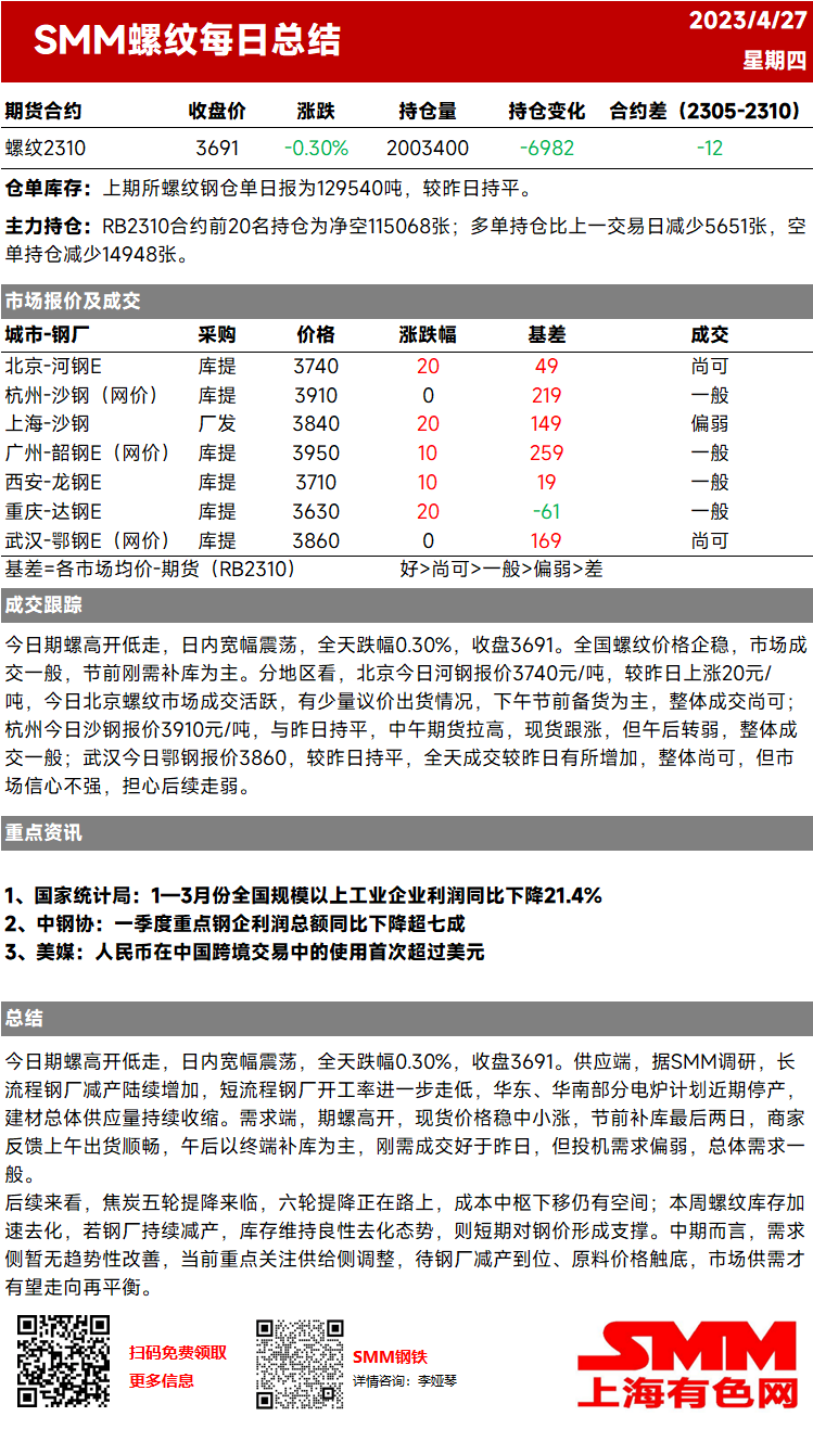 【SMM螺纹日评:期螺高开低走 钢价承压运行】今日期螺高开低走,日内宽幅震荡,全天跌幅0.30%,收盘3691。当前重点关注供给侧调整,待钢厂减产到位、原料价格触底,市场供需才有望走向再平衡······