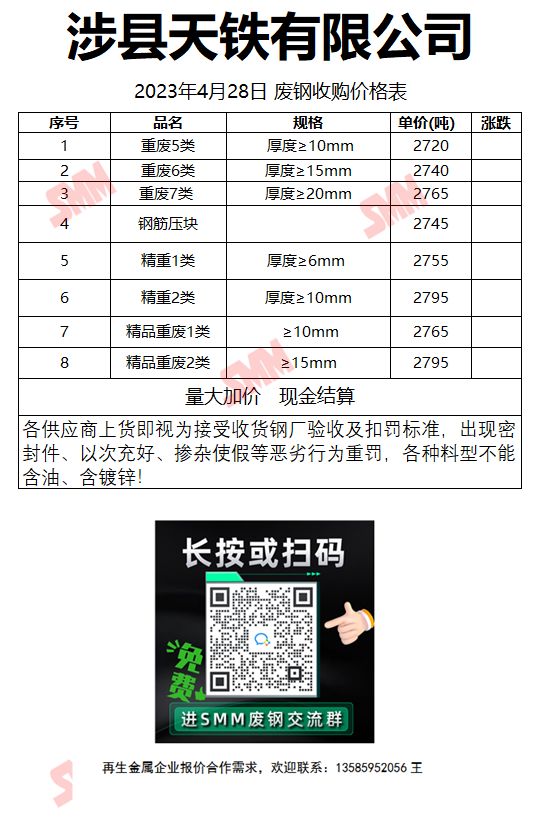 4月28日涉县天铁 废钢收购报价