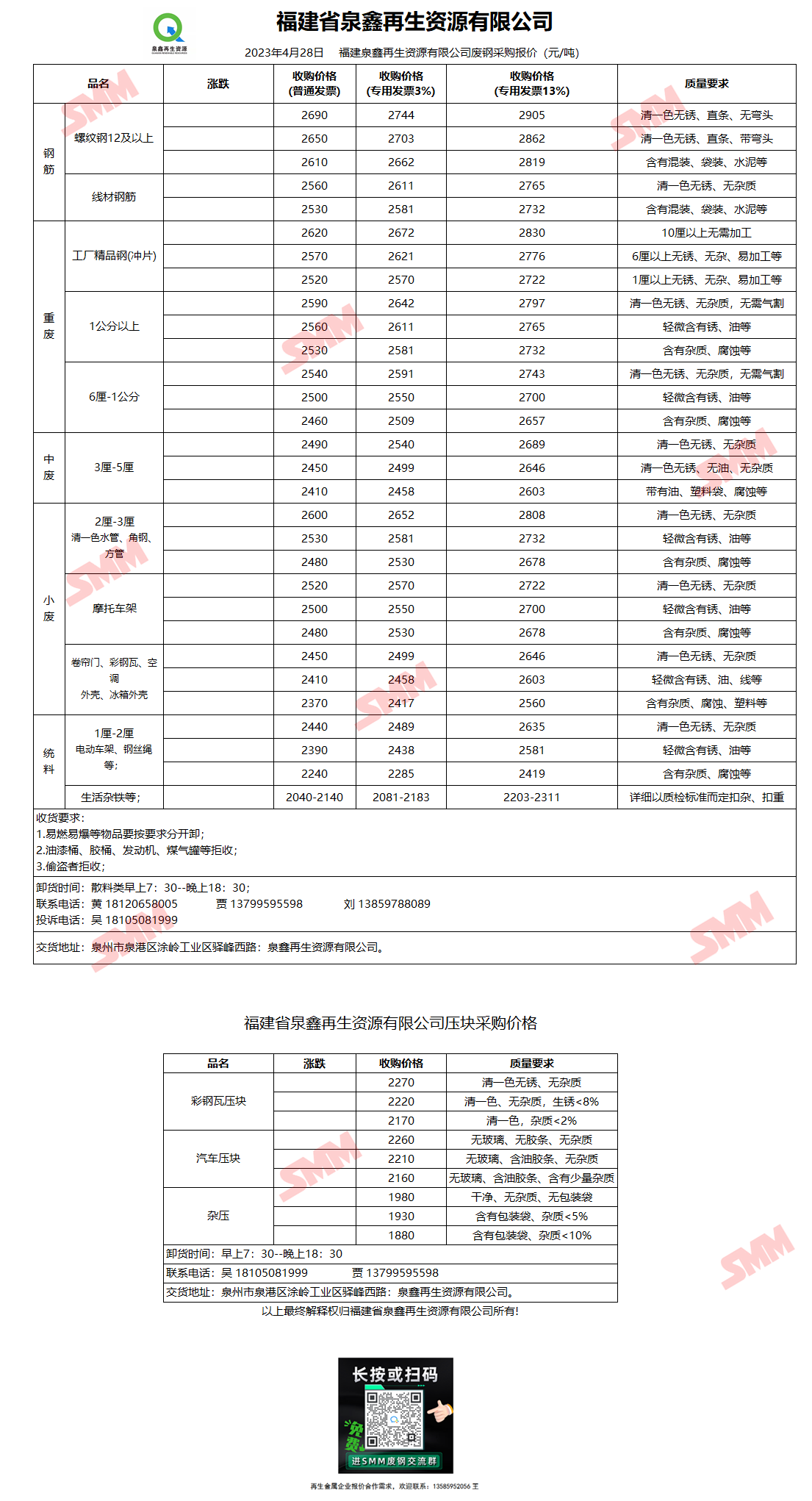 4月28日福建泉鑫再生 废钢采购报价
