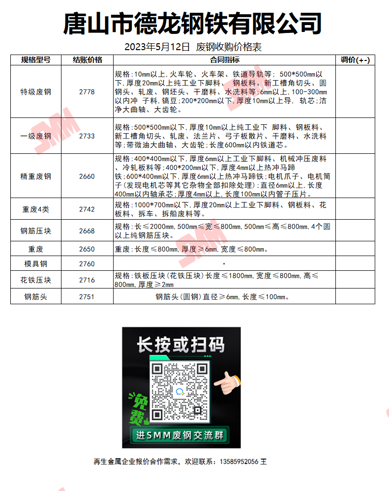 今日唐山德龙钢铁 废钢收购报价已更新,有货的朋友欢迎联系我们!
