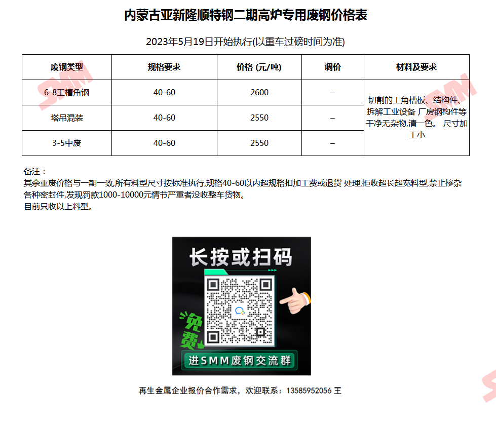 5月19日内蒙古亚新隆顺特钢二期 废钢收购报价