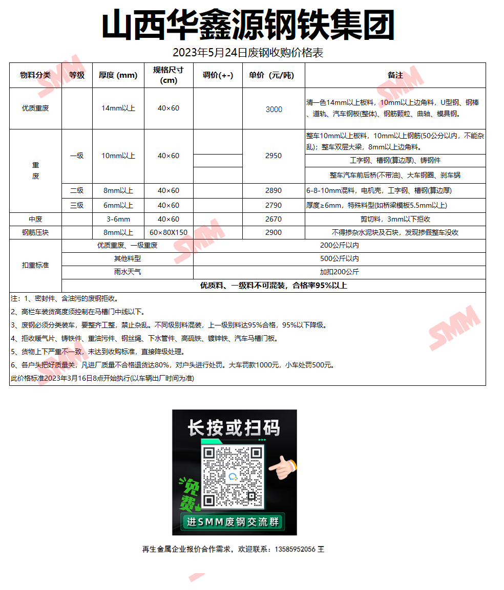 5月24日山西华鑫源钢铁 废钢收购报价