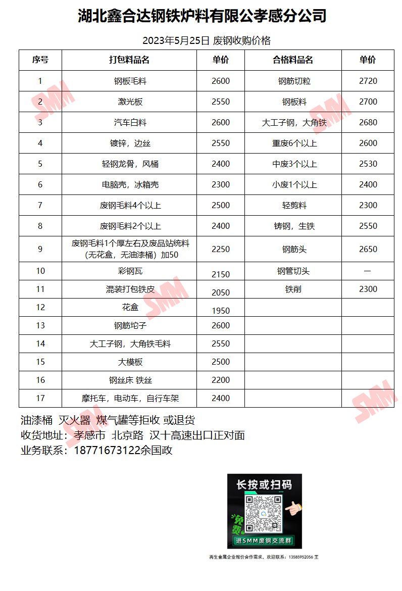 5月25日湖北鑫合达钢铁 废钢收购报价