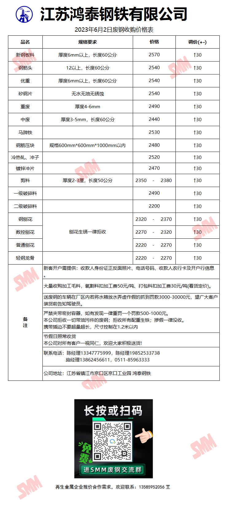6月2日江苏鸿泰钢铁 废钢收购报价