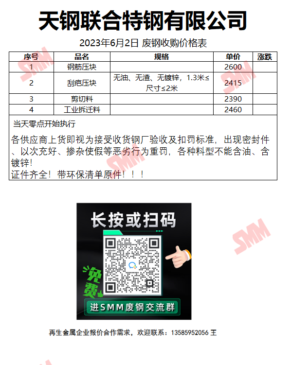 今日天钢联合特钢 废钢收购报价已更新,有货的朋友欢迎联系我们!