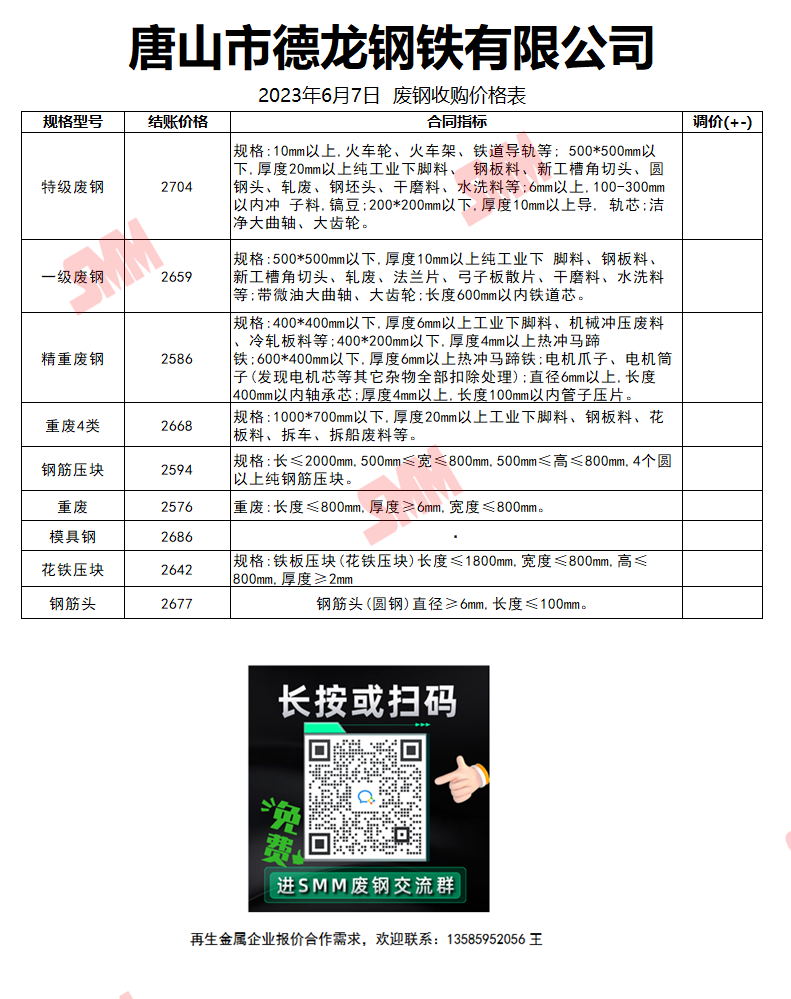 6月7日唐山德龙钢铁 废钢收购报价