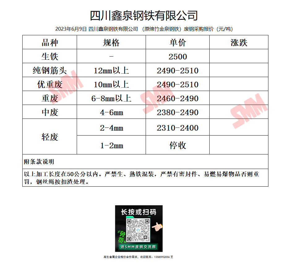 6月9日鑫泉钢铁(原绵竹金泉钢铁) 废钢采购报价