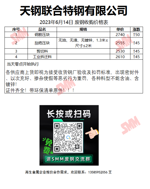 今日天钢联合特钢 废钢收购报价已更新,有货的朋友欢迎联系我们!