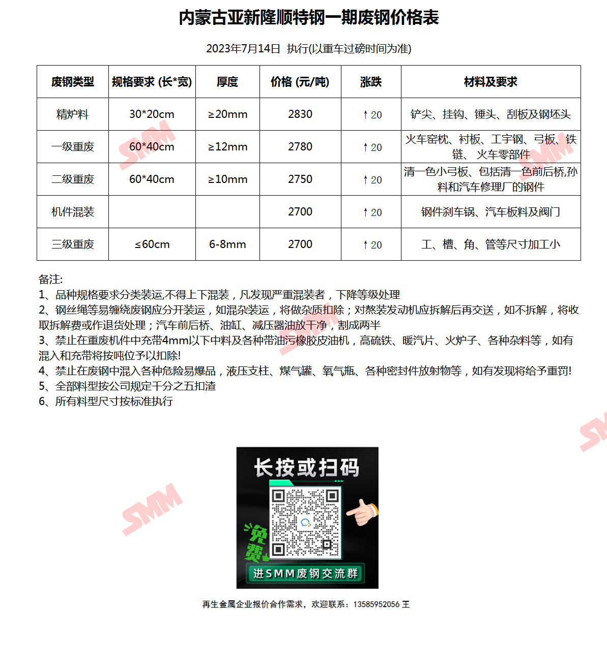 7月14日内蒙古亚新隆顺特钢一期 废钢收购报价