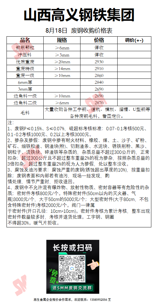 8月18日山西高义钢铁 废钢收购报价