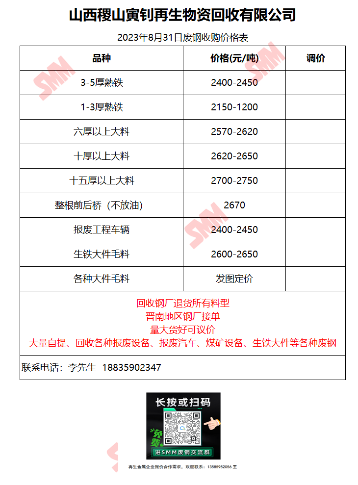 8月31日山西稷山寅钊再生 废钢收购报价
