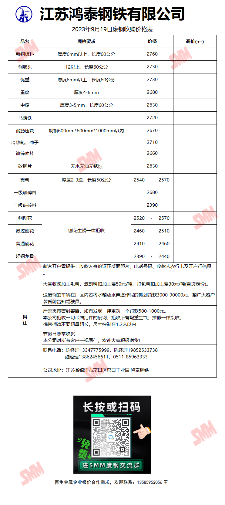 9月20日江苏鸿泰钢铁 废钢收购报价