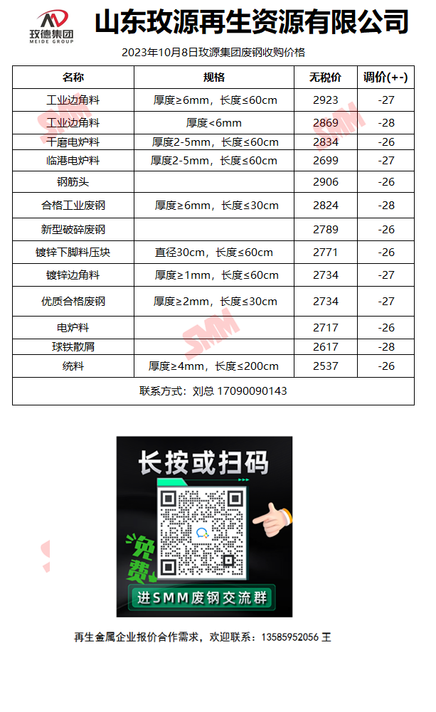 10月9日山东玫源再生 废钢收购报价