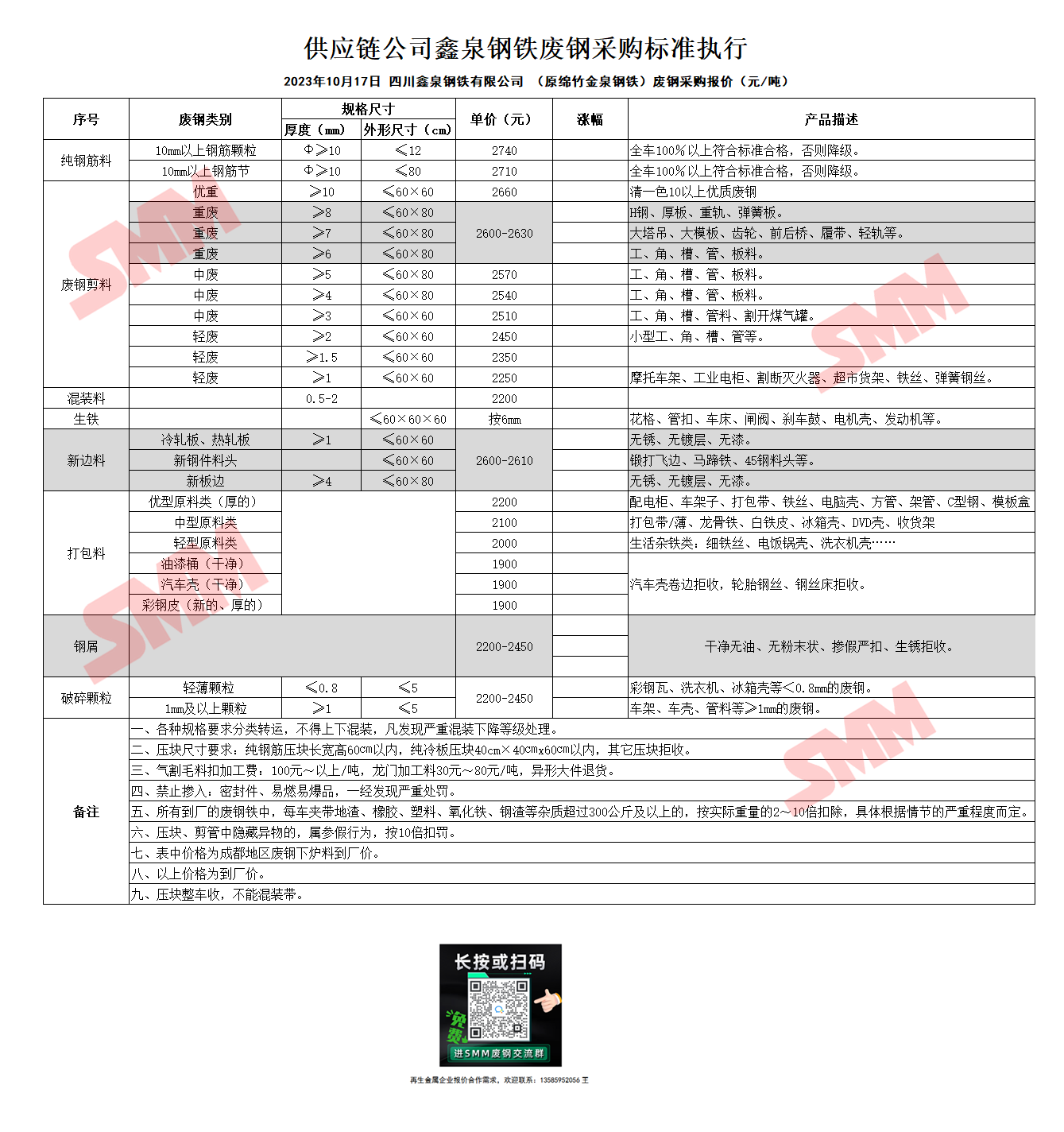 10月17日鑫泉钢铁(原绵竹金泉钢铁) 废钢采购报价