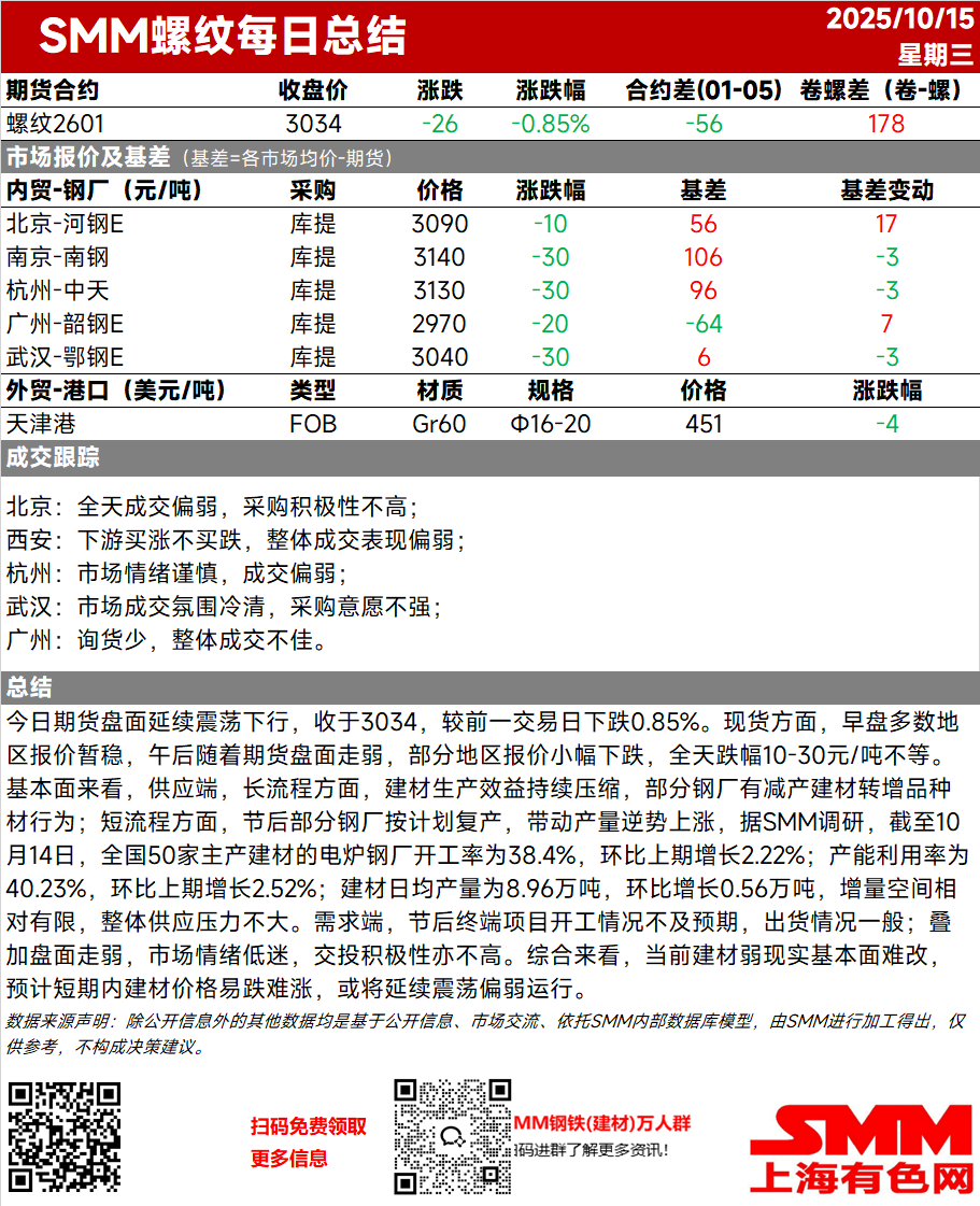 基本面来看,供应端,长流程方面,建材生产效益持续压缩,部分钢厂有减产建材转增品种材行为;短流程方面,节后部分钢厂按计划复产,带动产量逆势上涨,据SMM调研,截至10月14日,全国50家主产建材的电炉钢厂开工率为38.4%,环比上期增长2.22%;产能利用率为40.23%,环比上期增长2.52%;建材日均产量为8.96万吨,环比增长0.56万吨,增量空间相对有限,整体供应压力不大。需求端,节后终端项目开工情况不及预期,出货情况一般;叠加盘面走弱,市场情绪低迷,交投积极性亦不高。综合来看,当前建材弱现实基本面难改,预计短期内建材价格易跌难涨,或将延续震荡偏弱运行。