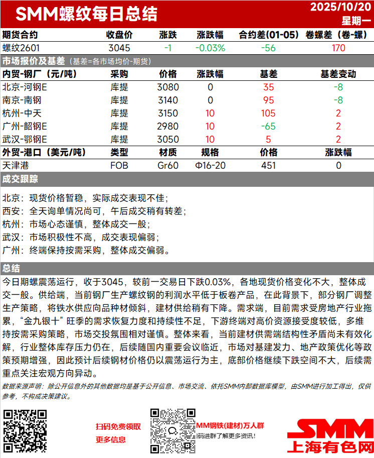 【SMM螺纹日评:供需结构仍待优化 后续钢材价格震荡运行为主】今日期螺震荡运行,收于3045,较前一交易日下跌0.03%,各地现货价格变化不大,整体成交一般·····