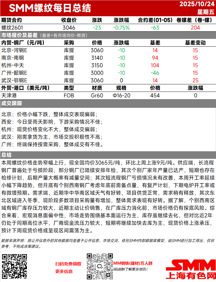 【SMM螺纹日评】供需双弱格局延续,建材价格承压运行