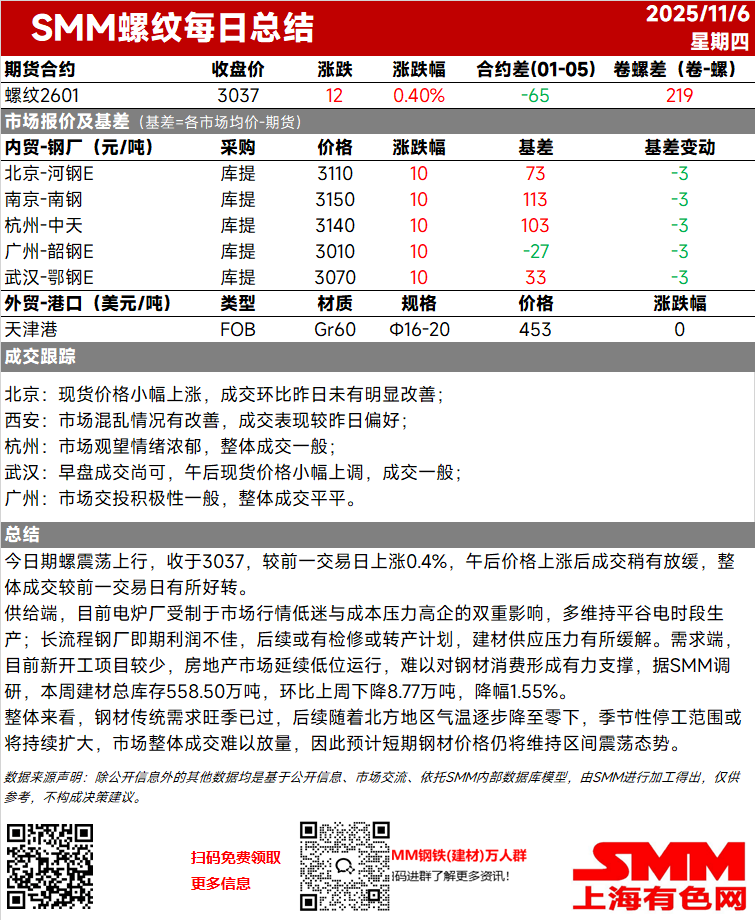 【SMM螺纹日评:建材总库存周环比下降1.55% 钢材价格短期难破震荡格局】今日期螺震荡上行,收于3037,较前一交易日上涨0.4%,午后价格上涨后成交稍有放缓,整体成交较前一交易日有所好转·····