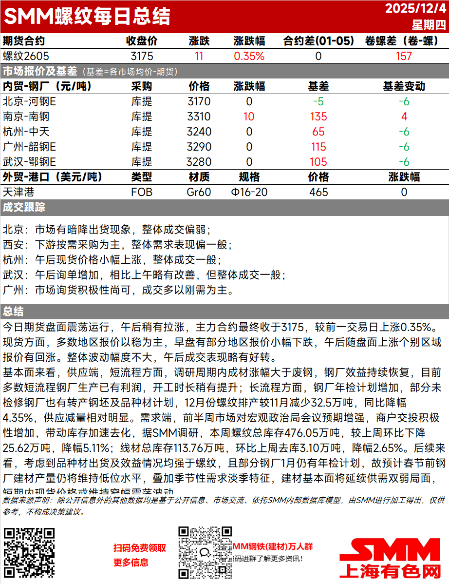 【SMM螺纹日评:钢厂年检增加 本期库存加速去化 12月供应减量明显】今日期货盘面震荡运行,午后稍有拉涨,主力合约最终收于3175,较前一交易日上涨0.35%。现货方面,多数地区报价以稳为主,早盘有部分地区报价小幅下跌,午后随盘面上涨个别区域报价有回涨……