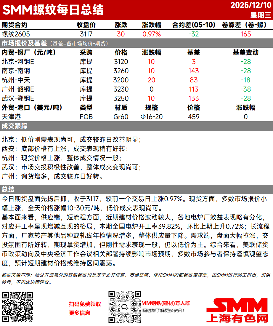 【SMM螺纹日评:宏观扰动下观望犹存 短期区间震荡格局未改】今日期货盘面先扬后抑,收于3117,较前一个交易日上涨0.97%。现货方面,多数市场报价小幅上涨,全天价格涨幅10-30元/吨,低价成交表现尚可。