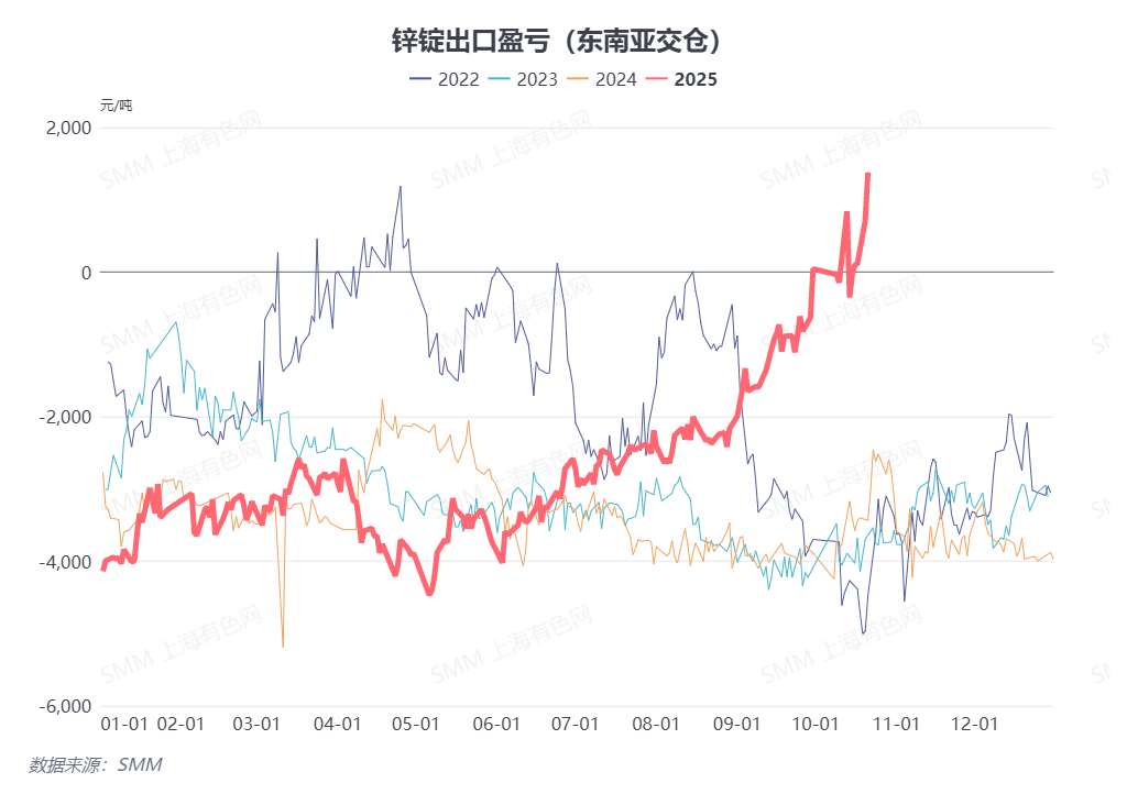 此外,在LME锌价一路上涨的同时,国内锌市场因供应过剩、需求不足持续拖累锌价走势,国内外锌市场表现分化,外强内弱格局凸显。自10月以来,中国锌锭进口亏损继续扩大,锌锭出口窗口偶尔开启,据SMM测算,截至10月21日,锌锭出口交仓盈利达1376元/吨,出口至东南亚现货盈利2016元/吨,利润驱动下,目前国内已有部分持货商开始出口交仓,随着这些锁价出口锌锭的流出,或对LME锌库存形成一定补充,后续LME锌“挤仓”实际发生概率或存疑,需持续关注后续锌锭出口情况。